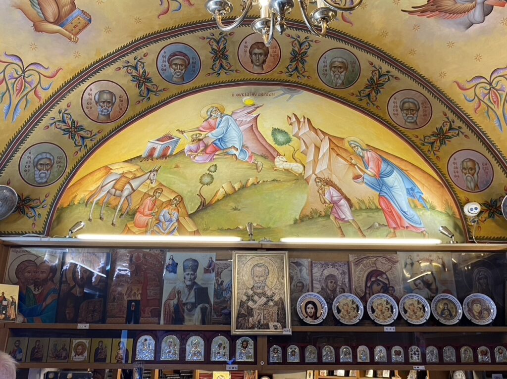 Photos: 1) our lovely chapel, 2) a view just outside Capernaum overlooking a bit of the Sea of Galilee (which is about half the size of lake Okanagan), with the rose-topped Orthodox Church on the left; 3) the camera wrecks the perspective of the half-dome, but otherwise the Abraham-Isaac scene over top the Orthodox Church gift shop was just one example of the stellar visual storytelling covering every square inch of the church’s interior.