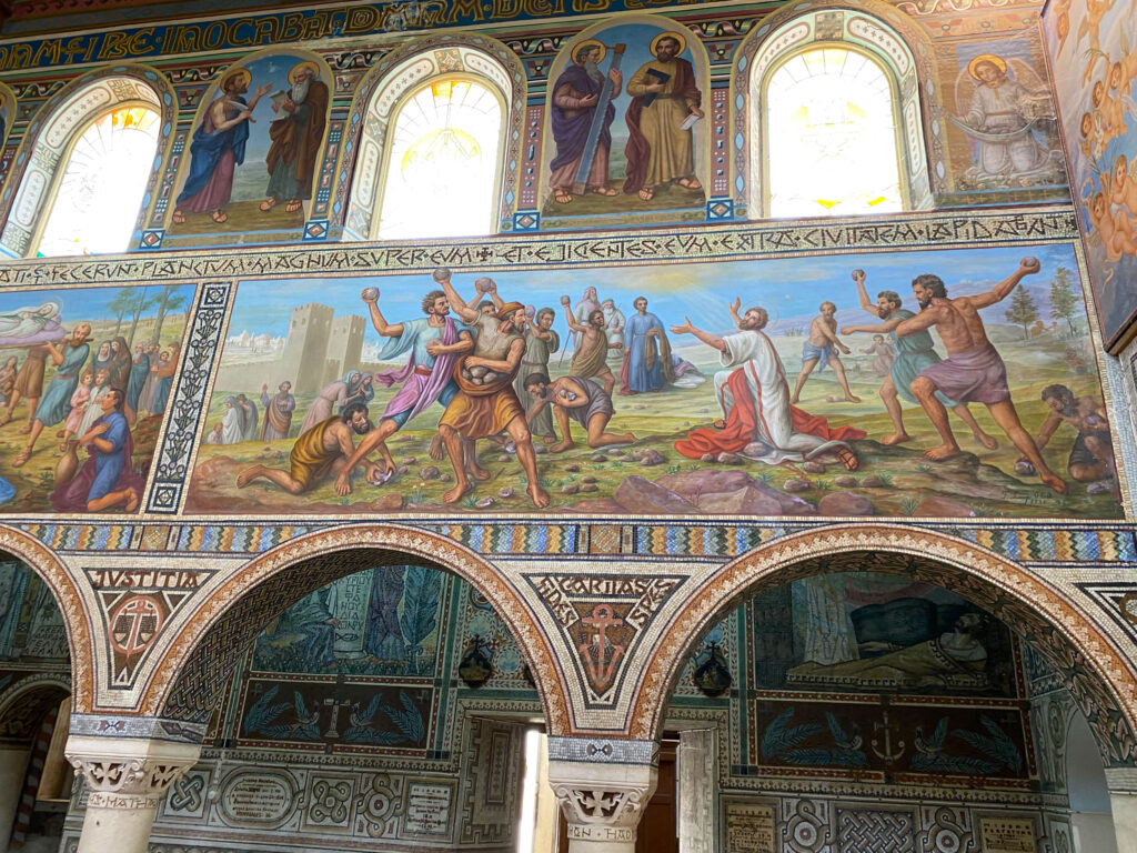 I have no new photos from this week, as everything I saw I simply absorbed with my own eyes. But here’s one I took previously from Saint Stephen’s church at the Salesian monastery in the Bet Shemesh valley. Every square inch of the interior is painted with moments of scriptural narrative. This is the third of four murals that chronicle Stephen’s (Acts 6) ordination, the religious trial, his execution, and burial here at this site.