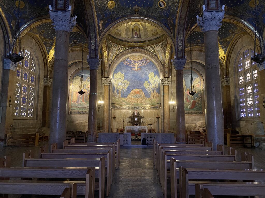 We made our way to St. Anne’s church on the edge of the Old City, where I departed to walk across the valley to Gethsemane while Father Roman attended his regional meeting. The narrow road up the Mount of Olives had some interesting sites at the top. I came back down to pop into the Gethsemane basilica. I’m sorry for the lack of tourist traffic and enterprise that comes from it, but I was also deeply thankful the church was empty and silent. Outside the church stand olive trees, a few of them dating back thousands of years, still standing vigil today—well the past the “one hour” he asked for.