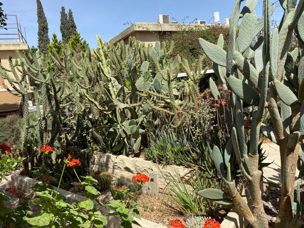 Photos: 1) A view of Jerusalem’s Old City (and newer city in the background) from the Mount of Olives; 2) Inside the Basilica of the Agony at Gethsemane, everything is mosaic, not painted; 3) the cactusarium—my nemesis are those bad boys on the left. It’s pretty crowded in there, so I’ll need to evict many of them. With great diplomacy.