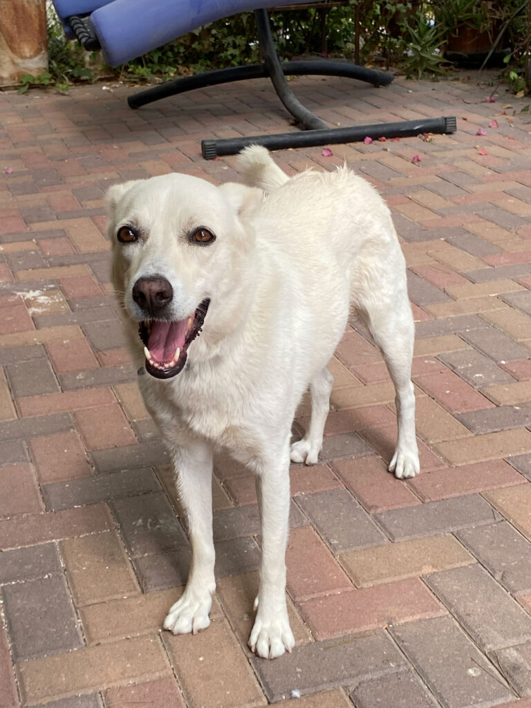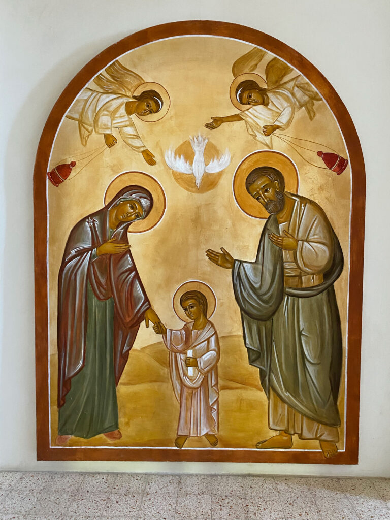 Photos: 1) a seven-foot-tall wall painting that welcomes every visitor to the Sisters of Bethlehem convent. 2) I’ll miss Shelleg (Snowy) and our daily walks together while I’m in Jerusalem. She’s finally free of her plastic medical cone while a sore healed on her leg, and much happier for it. 3) Socks (even thin ones) have become a somewhat forgotten item in my wardrobe these days.