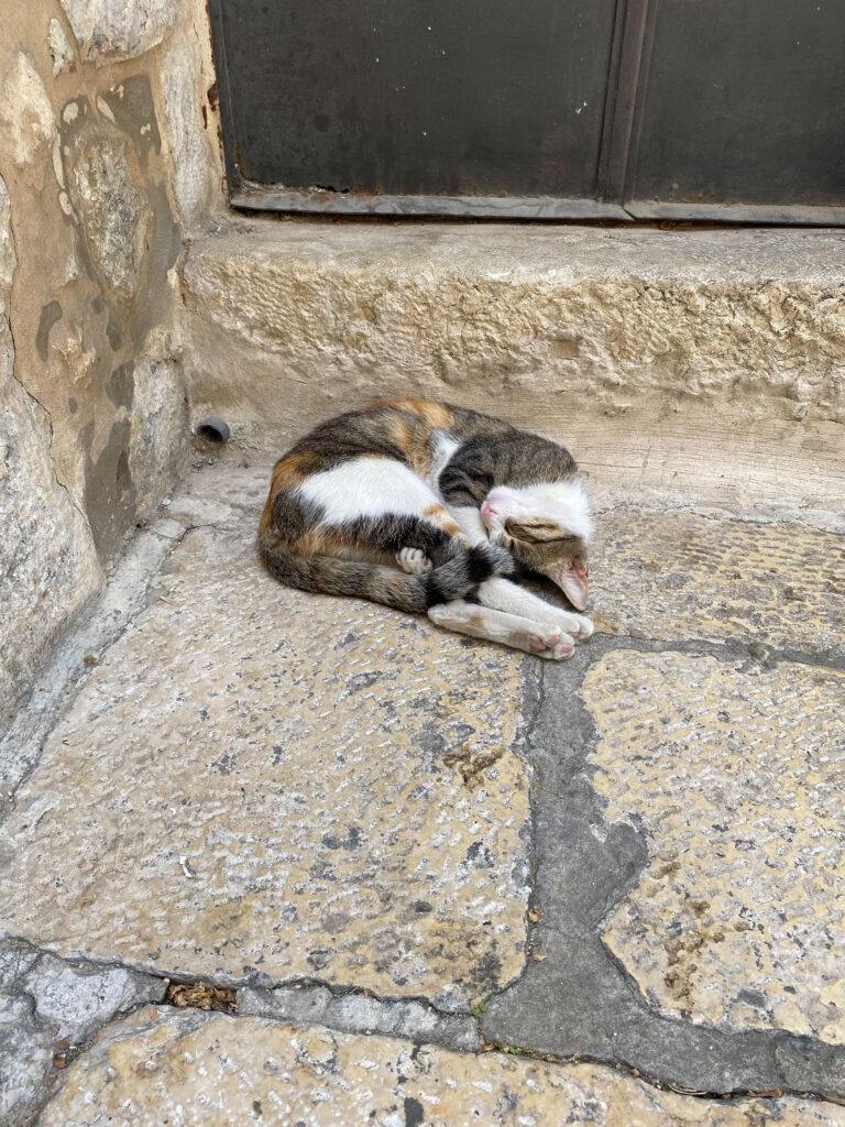 Photos: 1) Every single roof in Israel is adorned with a hot water tank and solar exchanger; 2) The art and architecture of the Church of the Flagellation is as bold and brutish as should be expected; 3) Most cats I’ve seen here are as evasive as they are engaged in their work. This has to be a rare moment of blissful reward for one old city resident.