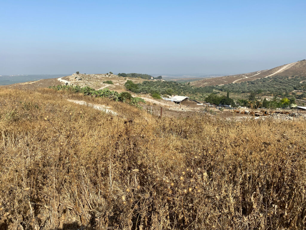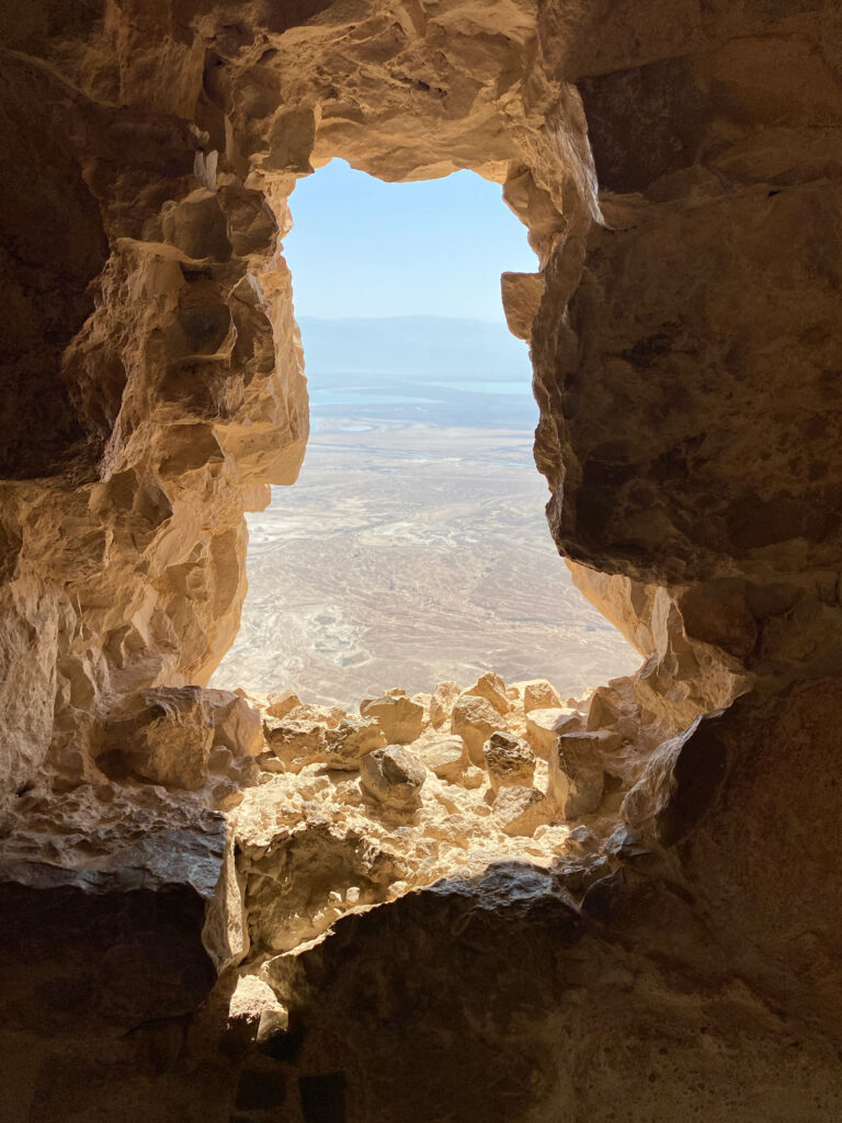 Photos: 1) the little hilltop village of Deir Rafat, with monastery just over the other side. All the brown vegetation in the photo equals super nasty thorn and thistle plants reaching up to tickle your armpits. You just don’t go in there; 2) A view of the Dead Sea and foreground plains from one of the military lookouts at Masada. At least they had shade; 3) The Dead Sea and Jordan in the background at the top, the Qumran village (and tourist visitor centre) middle-left, and roasting rock shards at my feet.